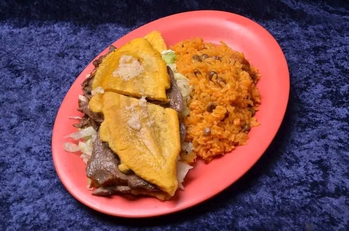 Chicago's very own Jibarito - succulent steak with onions nestled between crispy plantains, adorned with fresh lettuce, juicy tomato, and tangy mayo. A local culinary marvel